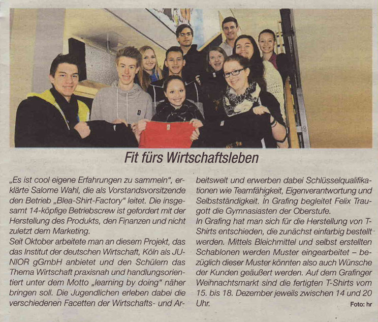 Die Schüler besuchen seit September das P-Seminar Jungunternehmen bei Lehrer Felix Traugott. Das Projekt ist ein „JUNIOR-Schülerfirmenprogramm“ und wird vom Institut der deutschen Wirtschaft gefördert. Der Geschäftsplan: Die Gruppe verkauft selbstgestaltete T-Shirts.